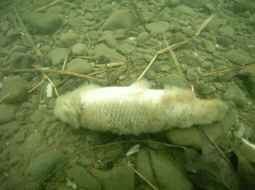 Tak wygląda rzeka pod powierzchnią. Na dnie widoczne szczątki ryb.