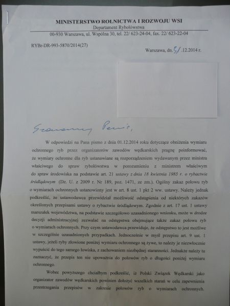 Stanowisko Ministerstwa Rolnictwa i Rozwoju Wsi dot. obniżania wymiarów ochronnych ryb, przez organizatorów zawodów w PZW.