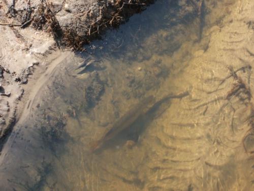 Taki widok zastalismy gdy dotarlismy nad jeden z pstragowych doplywow Wkry(tu jeden ze szczupakow stojacych pod mostkiem-tak na oko 70cm i2,5-3kg)Jak na 2 metrowej szerokosci siurek rybka calkiem spora.
