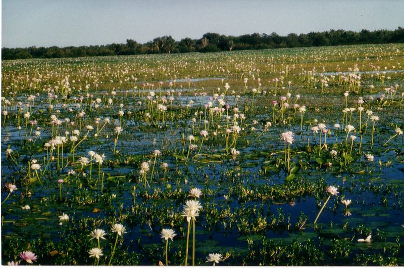Niebezpieczna sielanka, pod liliami wodnymi czychaja krokodyle. Kakatoo National Park.