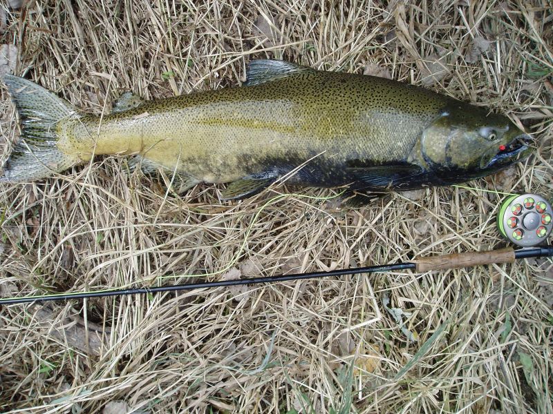 Piekny okaz samca lososia(king)38cali-96cm.Wyraznie widac wydluzony lep i bardziej wygarbiona sylwetke ryby.