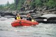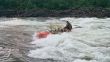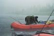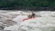 Ruszyliśmy dalej. Woda ciągle podnosiła się. Łowienie stawało się coraz trudniejsze a ryby coraz mniej skłonne do współpracy. Nasze pontony płynęły bardzo szybko , odcinki których przebycie przewidziane było na trzy cztery godziny, pokonywaliśmy w niecałe pół , a wszystko za sprawą podniesionego stanu wody. W niespełna godzinę dotarliśmy do miejsca naszego następnego przystanku miał on miejsce tuż za wodospadem. Powodziowa woda wymuszała na nas zachowanie szczególnej ostrożności. Jeszcze dwa dni wcześniej przeskoczylibyśmy przez wodospad z rozpędu, ale nie dziś, nie przy tej wodzie. Sasza jakieś 300 metrów powyżej wodospadu zarządził postój. Wysiedliśmy na brzeg , w dłonie wzięliśmy kije tudzież inne rzeczy które mogły by przepaść w odmętach Gorbiaczina. Ruszyliśmy nad sam wodospad. Doszliśmy. Naszym oczom ukazał się prawdziwy żywioł. Od razu przywiódł mi na myśl zdjęcia jakie kilka lat temu widziałem podczas powodzi w Chinach. Potężna rzeka przed wodami, której można tylko czuć respekt I strach. Co prawda Igor rysował placem trasą, którą teoretycznie można by przepłynąć, jednak było to tak mało realne, że Sasza spokojnie wysłuchał a gdy ten skończył, powiedział stanowczo- Nie, popłyniemy pod drugim brzegiem. Tam woda była trochę spokojniejsza. . Przepłynęliśmy rzekę I stanęliśmy jakieś 100 metrów od wodospadu.