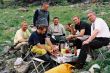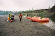 Rozpoczęły się przygotowania do przejścia progu. Najpierw przenieśliśmy w bezpieczne miejsce wędki aparaty I inne rzeczy o których stratę można było się obawiać . Namioty, rzeczy osobiste pozostały w pontonach, tyle tylko, że zostały skrępowane dodatkowymi linami. Szykowała się świetna zabawa. Ja płynąłem w pontonie z Leszkiem, Saszą , Igorem I Loszą. Wyglądało to miej więcej tak. Po pokonaniu wypłyceń I dotarciu do nurtu Sasza zaczął komenderować . Krzyczał , wolno , wolno, wolno, a po chwili dawaj! Wpieot! Wpieot Potem - Wprawo, nazat I tak dalej. A my posłuszni jak ułańskie kasztanki wykonywaliśmy jego polecenia. Wokół nas huczała woda. Wyglądało groźnie. Jednak nasz ponton przepływał pomiędzy bałwanami tak jak by to on słuchał głosu Saszy a nie my. Wszystko trwało chwilę. W niespełna minutę z uśmiechem na twarzy dobijaliśmy do zatoczki za wodospadem. Wyszycy zadwoleni, szczęśliwi na usta cisnęły się nam słowa Veni, Vidi, Vici. Tak zwyciężyliśmy I to w jakim stylu bez strat własnych, bez utraty sprzętu a wyglądało tak groźnie. Rokoszowaliśmy się jeszcze chwilę naszą wygraną, koledzy wskazywali palcem na wzburzoną rzekę, było pięknie. Jednak nasze zwycięstwo jak każda wielka chwila miało swój prozaiczny koniec. Trzeba przystąpić do nudnych ale niezbędnych czynności obozowych, czyli rozbić namioty. Obozowisko rozbiliśmy na dużej półce skalnej. Był to błąd ponieważ tak wybrane miejsce na biwak powodowało, że łowić mogliśmy w zasadzie tylko na przestrzeni 300 m, do pozostałej części rzeki dostępu strzegły pionowe skały. Wysoka mętna woda dodatkowo utrudniała nam uprawianie naszej pasji. Po kilku próbach każdy wracał zrezygnowany I siadał przy suto zastawionym stole. Tylko Felek wykazywał duże zacięcie do zwiedzania bo godzinami w samotności przemierzał kamienisty brzeg Gorbiaczina. Był już zamęczony, podróżą , przeżyciami z poprzedniego dnia. Nic dziwnego mógł najeść się strachu walczył o życie. Ale I on po odbyciu spaceru zasiadł do stołu, zjedliśmy kolacje I poszliśmy spać.