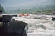 Rozpoczęliśmy spływ. Płynęliśmy z nową energią właściwą , nowym przygodom które nas miały spotkać. Po przebyciu jakiś trzech może czterech kilometrów nad nasze głowy nagle nadpłynęły kobaltowe chmury a z nieba polała się woda. Nie był to deszcz jaki przeżywaliśmy na Gorbiaczninie 3 –4 razy dziennie, była to prawdziwa zemsta Zeusa. Niebo co chwilę rozdzierane było błyskawicami, a ilość światła, którą wydzielały I grzmot im towarzyszący przypominały te z filmów grozy. Widoczność spadła praktycznie do 0. Nie pozostało nam nic innego jak tylko schronić się na brzegu. Gdy wydawało się ze zapowiada się dłuższa przerwa na półce skalnej, którą w pośpiechu wybraliśmy na przystanek, chmury znikły a na niebie pojawiło się słońce.