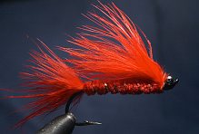 Muchy stosuję duże, w jaskrawych kolorach, na hakach łososiowych wielkości 1/0-5/0, najczęściej jednak 2/0. Podstawowe materiały, których używam do robienia trociowych much to koza, królik, marabut, lis. Skrzydełka warto wzbogacić odrobiną Crystal Flashu. Muchy często wyposażam w niewielkie blaszane oczy z łańcuszków, lub w razie potrzeby dociążam ołowianymi “mundkowymi” oczami. Przy konstruowaniu much trociowych warto eksperymentować z materiałami, kolorami, czy wielkością, bo troć miewa różne gusta i często atakuje nawet bardzo dziwne przynęty. Ponizej przedstawiam kilka sprawdzonych wzorów much, na które złowiłem najwięcej ryb. Są to muchy “prosto” z mojego pudełka, wiec wybaczcie drobne niedoskonałości.