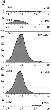 że tylko co trzeci osobnik przed osiągnięciem 30 cm długości odbywa pierwsze