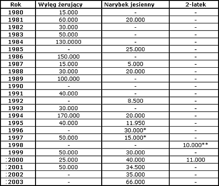 się zakupami narybku ze Słowacji (1996-1997) i od prywatnego hodowcy (1998),