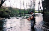 Andrzej zaczyna łowić, a ja idę w dół biegu rzeki, licząc na spotkanie bardziej czytelnych miejscówek. Pierwsze bystrze wygląda obiecująco. Majestatyczna woda napotyka tu na żwirowy garb, wypłyca się nieco, rozszerza i przyspiesza. Decyduję się spenetrować miejscówkę mokrą muszką. Kilkunastominutowe biczowanie nie przynosi skutku.