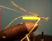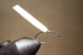 Pasmem jedwabiu owijamy wszystkie materiały jednocześnie profilując gąbkę kontrolowanym napinaniem pasma jedwabiu aby zwężały się jak naturalny odwłok owada i wzmacniamy cały ogonek przewijając nicią podstawową, a przy końcówce zaciskamy mocniej dwie pętelki nici (jak przy mocowaniu skrzydełek much mokrych) i wykonujemy supełek – musimy do tego celu zdjąć na chwilę muchę z imadełka – i odcinamy ostrożnie cążkami zbędny fragment pianki uważając na inne materiały, odcinamy również nić podstawową.