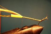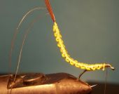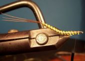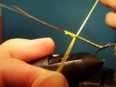 Łapiemy pętelkę z nici w szczypce i owijamy tułów muszki zaznaczając jej segmenty, łapiemy nicią podstawową i odcinamy zbędny fragment. Możemy teraz lekko polakierować odwłok (nie lakierujemy kiedy jedwab był wcześniej nawoskowany).