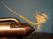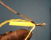 Teraz przywiązujemy kolejno: plastikową lametę, jedwab, promienie bażanta.