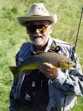 Andrzej mnie wnet ominął, w swoistym dla niego tempie brodził w dół rzeki. Za zakrętem rzeki ukazała się głęboka płań przed pionową skałą. Tu zaczynal się malowniczy przełom Bobru przez Góry Kaczawskie. Na jej wlocie dostojnie machał wędziskiem Janek Błachuta. On jeszcze perfekcyjnie włada klasyczną mokrą muchą, czego mu bardzo zazdroszczę. Z imponująca brodą i finezyjnym kapeluszem wyglądał jak Liczyrzepa osobiście. Stosownie, bo do Karkonoszy nie było daleko. Wcisnąłem wędzisko pod pachę i wyjąłem aparat fotograficzny.