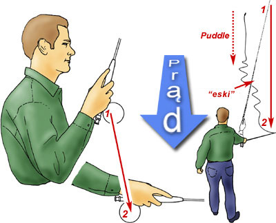 Podczas wykonywania "reached puddle" warto pamiętać o dwóch pułapkach. Po pierwsze, musimy wysnuć odpowiednio większą ilość linki, żeby przy odciągnięciu szytówki nie zmniejszyć dystansu. Drugi problem jest ściśle związany z pierwszym. Przy przesuwaniu szczytówki następuje szarpnięcie sznura powodujące zmiane lotu i miejsca prezentacji muchy. Rozwiązanie jest bardzo proste, należy skoordynować wyrzucenie linki z przesunięciem szczytówki wędki. Pozwala to na osiągnięcie zamierzonego celu i ułożenie sznura w pożądany sposób.