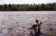 Następnego dnia Rzeka dalej niosła bardzo wysoką wodę I mieliśmy duże obawy aby w niej brodzić. W związku z tym postanowiliśmy odwiedzić drugie z jezior tym. W zeszłym roku Rafał I kilku kilowe tęczaki. Jezioro podobnie jak to wcześniejsze otoczone było lasem jednak było znacznie większe około 25 ha. Również to jezioro było przygotowane profesjonalnie do wędkowania. Na około pomosty nad brzegiem łódka. Nad jeziorem okazało się że dobre brania mają tylko Szwedzi łowiący na krewetki I Franek, który z Rafałem popłynął łodzią. Tego dnia padły tylko 3 ryby I wszystkie złapał na suchą muchę Franek. Następnego dnia bogatsi o doświadczenie o 7 rano stanęliśmy pod sklepem z krewetkami. Michaś zakupił 0,5 kg tych żyjątek na jego twarzy widać było pewność że tym razem to je rozgromi. I rzeczywiście nad wodą Michaś miał wiele do powiedzenia, ciągnął tęczaka za tęczakiem. Jego sukcesy w wędkowaniu wywarły takie wrażenie, że niektórzy z kolegów (nie będę wymieniał z imienia aby ich nie skompromitować) również przezbroili sprzęt na zestaw krewetkowy I ciągli tęczaki.