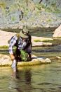 Znowu wspinaczka; tym razem prawdziwie w gore i po lunchu, decydujemy sie na zmiane odcinka. Znajdujemy sie teraz w szerszej dolinie, obfitujacej tym razem w spowolnienia i wyciszenia nurtu. Starto lowi bardzo dokladnie, puszczajac mnie przodem. Ja jestem zrelaksowany, spokojem i pieknem otoczenia, a i chyba tym, ze mam juz na koncie ladna rybe. Lowie powoli...Wbrew utartym technikom nowozelandzkim, probuje lowienia na nimfe podchodzac do stanowisk z pradem. Mam przed soba zaglebienie z szafirowa woda przy samym brzegu, do ktorego zblizam sie jednak dosc ostroznie. Rzucam przed siebie i daje nimfie swobodnie splynac w dolek. Delikatne przytrzymanie, zaciecie i spory, ale spokojny opor. Ryba daje sie bez problemow podholowac i ...mam przed soba najwiekszego potokowca jakiego w moim krotkiej muchowej karierze widzialem! Spokojnie, acz drzacymi rekoma daje mu dosc dluga chwile pochodzic, na krotkie zreszta odleglosci, zanim chwytem za glowa laduje go na brzeg. Jakze inaczej walczy potokowiec w porownaniu z teczakiem. Ryba jest piekna, mierzy rowne 60 cm i oceniam ja na dobre 2,5 kg. Dla mnie wrazen wystarczy. Strato dochodzi do mnie i gratuluje, zaczyna w koncu tez lowic na ponizszej glebszej plani. Teczak, jeden i drugi. Piekne, grube, ostro walczace. Ja posuwam sie z pradem, chyba jeszcze bardziej odrealniony, gdy nagle czuje, ze woda robi sie coraz glebsza i szybsza. Odwrotu jednak nie ma i musze probowac dostac sie do plytszej wody. Woda jest jednak silniejsza i w koncu po nieostroznym kroku plyne...Szybko probuje wydostac sie na brzeg, bo wypelnione wodery to betka; na mysli mam moj aparat w wcale-nie- wodoszczelnym pokrowcu. Szybka akcja robi swoje i po wylaniu odrobiny wody z pokrowca, oddaje sie zasluzonemu suszeniu.