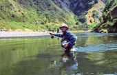 Poki, co zeszlismy w dol. Woda szybko plynaca, dno zalegaja mniejsze, wieksze, a czasem i olbrzymie glazy – kraina teczaka! Strato (ktorego juz znacie z moich poprzednich artukulow) probuje upstream-nymphing w plytszym bystrzu i dostaje kilka maluchow – tj. ok. 30 cm potokowcow. Nie po nie jednak zeszlismy wiec posuwamy sie w dol rzeki. Brzeg usiany jest olbrzymimi glazami, wiec trzeba je pokonywac wspinajac sie na nie, lub obchodzac przez busz – tez nic przyjemnego, wole juz wspinaczke! Doszlismy do zakretu z gleboka woda, i znowu szybszym przemialem, i bystrzem itd. Strato zacina piekna rybe, ktora po kilku efektownych wyskokach niestety odpina sie przy nogach. Ciche przeklenstowo i dalej cierpliwie oblawiamy miejsce po miejscu. Zaskakujaco malo sie dzieje, ale takie wlasnie sa dzikie rzeki w Nowej Zelandii – to ryby wybieraja sobie miesjca, w ktorych maja ochote przebywac. Ja decyduje sie na glebokie przewezenie, przed bystrzem. Na koncu mam sporej wagi Pheasant Tail’a w wersji flash-back ze zlota glowka oczywiscie. Teczaki to lubia, a ekstra waga tylko pomaga sie do nich dostac. Rzucam oczywiscie w gore rzeki i chyba przy jednym z pierwszych splyniec, sznur gwaltownie przesuwa sie pod prad. Zacinam z wyczuciem i ...chyba smialo moge powiedziec, ze woda eksploduje wypluwajac piekna okolo 1,5 kg rybe w powietrze. Nie daje jej zejsc w bystrze, bo prad mi ja po prostu zabierze. Probuje ja sila zatrzymac na glebokiej wodzie. Udaje mi sie i po jeszcze kilku odjazdach mam ja na brzegu. Pierwsza ryba na Mohaka. Robie jej pamiatkowe zdjecie (to wlasnie portret tlustego teczaka z mojej galerii; nimfe widac na kamieniu). Koledzy jednak narzekaja. Dwu z nich nie mialo kontaktu z ryba, a i Strato cos nie ma szczescia – urywa kolejna piekna rybe wraz ze streamerem.